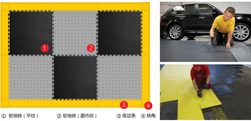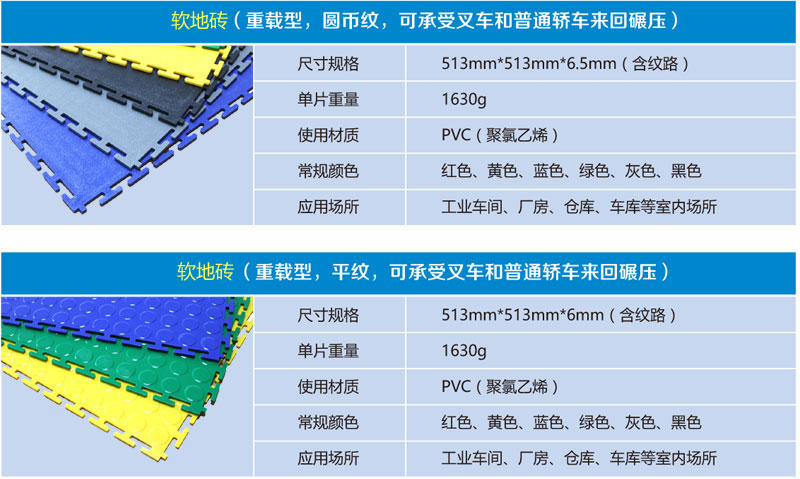 Soft floor tiles with 100% pure new PVC environmental protection raw material production, can be quickly installed on any existing substrate, especially the ground to excessive wear, paint delamination, dust, moisture and contamination, etc., can not affect the rapid escalation of the implementation of the ground under the condition of the normal production workshop.