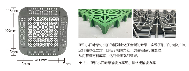 正和小四葉草采用通扣設(shè)計(jì),可以確保產(chǎn)品鋪設(shè)完成后在任何區(qū)域單獨(dú)取出,極大的方便了客戶后期局部清理泥沙等,給店面的日常衛(wèi)生維護(hù)提供了很好的基礎(chǔ)。