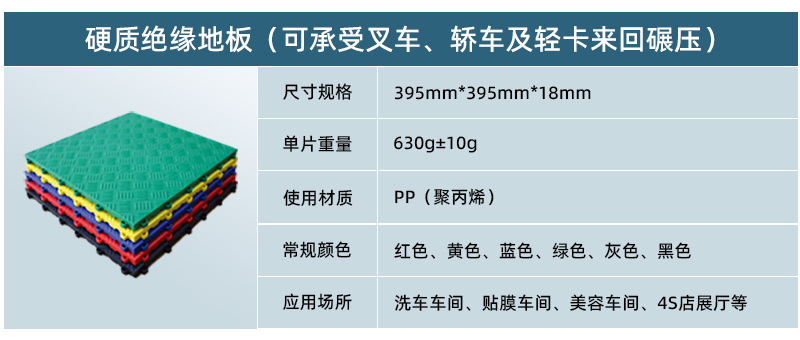 針對(duì)汽車快修車間、美容養(yǎng)護(hù)車間、汽車維修廠等區(qū)域,正和硬質(zhì)絕緣地板成為地面升級(jí)的全新選擇。正和硬質(zhì)絕緣地板下方密布數(shù)百個(gè)支撐點(diǎn),完全可以承受車輛的來(lái)回碾壓,具有安裝快速簡(jiǎn)便、對(duì)基礎(chǔ)要求寬泛、容易清理等特點(diǎn) ,特別適用于車庫(kù)地面鋪設(shè)使用,也可作為產(chǎn)品展示的臨時(shí)展臺(tái)使用。 正和硬質(zhì)絕緣地板采用100%純新PP材料生產(chǎn)而成,無(wú)毒、無(wú)味、環(huán)保,可回收利用,也可以用于健身房、辦公室等商用領(lǐng)域地面使用。