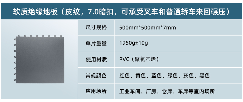 軟質(zhì)絕緣地板采用純新軟性PVC(聚氯乙烯)生產(chǎn)而成,具有防滑、防油、靜音、抗沖擊、高承載等特點(diǎn),可以快捷安裝在任何現(xiàn)有的基板,包括木材,混凝土,環(huán)氧樹脂,瓷磚,水磨石等,廣泛應(yīng)用于車間廠房地面、倉(cāng)庫(kù)地面、車庫(kù)地面、健身房、展廳等場(chǎng)所。