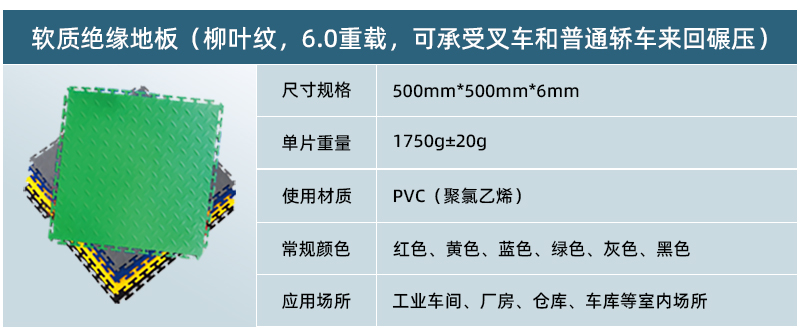 5、高承載,更防滑: 軟質絕緣地板為實心結構,只要地面承重沒有問題,其承載能力能夠達到每平米10噸以上。地板表面在生產(chǎn)過程中帶有