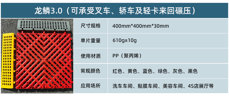 1.龍鱗紋設(shè)計(jì),防滑,美觀,寓意好 2.選用高級(jí)原料,加入其他輔料,顏色亮麗,無異味,無污染 3.顏色為紅黃藍(lán)綠黑灰六色,滿足客戶用色需求,搭配屬于自己的風(fēng)格 4.通扣鎖扣設(shè)計(jì),容易鋪設(shè)且容易拆卸打理 5.加強(qiáng)支撐,不容易出現(xiàn)壓壞壓斷現(xiàn)象,滿足大多數(shù)車輛施工的要求 6.使用年限長(zhǎng),3年超長(zhǎng)質(zhì)保,使用無后顧之憂 7.不同厚度,采用不同支撐,保證承載最大化的同時(shí),且易排泥排水