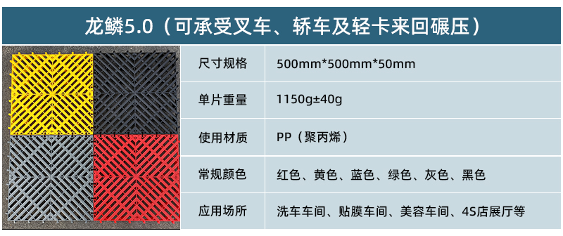 1.龍鱗紋設(shè)計(jì),防滑,美觀,寓意好 2.選用高級(jí)原料,加入其他輔料,顏色亮麗,無異味,無污染 3.顏色為紅黃藍(lán)綠黑灰六色,滿足客戶用色需求,搭配屬于自己的風(fēng)格 4.通扣鎖扣設(shè)計(jì),容易鋪設(shè)且容易拆卸打理 5.加強(qiáng)支撐,不容易出現(xiàn)壓壞壓斷現(xiàn)象,滿足大多數(shù)車輛施工的要求 6.使用年限長,3年超長質(zhì)保,使用無后顧之憂 7.不同厚度,采用不同支撐,保證承載最大化的同時(shí),且易排泥排水